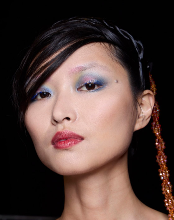 على الرغم من أن ظلال العيون الدخانية التقليدية تعتمد على الألوان الترابية أو الداكنة، إلا أن عروض الأزياء العالمية في أسابيع الموضة لموسم ربيع وصيف 2024، حملت معها نسخة جديدة ومبتكرة لمكياج العيون الدخاني، باستخدام الألوان الزاهية، مثل الأزرق الفاتح والأخضر الزمردي والأرجواني المشرق. هذه الألوان أضافت حيوية على المكياج الكلاسيكي، ما جعلها ملائمة للأجواء الربيعية والصيفية بامتياز. كوني السبّاقة في مواكبة أحدث صيحات رسمات العيون الملونة، واختاري ظلال العيون بتدرجات اللون الأزرق، وطبقيه عند زاوية العين الداخلية والخارجية على طول خط الجفون المتحركة، وطبقي ظلال عيون آخر باللون الأرجواني عند منتصف خط الجفون المتحركة. وحددي خط الرموش السفلية بخط ناعم من ظلال العيون الزرقاء، على طريقة عارضة دار جورجيو أرماني بريفيه Giorgio Armani Privé في أسبوع الموضة الباريسي لربيع وصيف 2024.