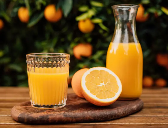 4- عصير البرتقال: إن عصير البرتقال الغني بفيتامين C يعمل على تفتيح البشرة ويساعد على توحيد لونها عن طريق تثبيط إنتاج الميلانين، الصبغة المسؤولة عن لون البشرة، مما يؤدي إلى تقليل البقع الداكنة وإفساح المجال لبشرة أكثر تجانسًا.