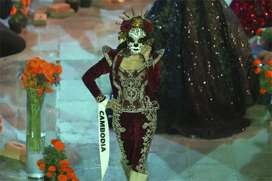- ملكة جمال كمبوديا دافين براساث، في لقطة جميلة، وهي تستعرض ثيابها وتضع قناعا على وجهها.