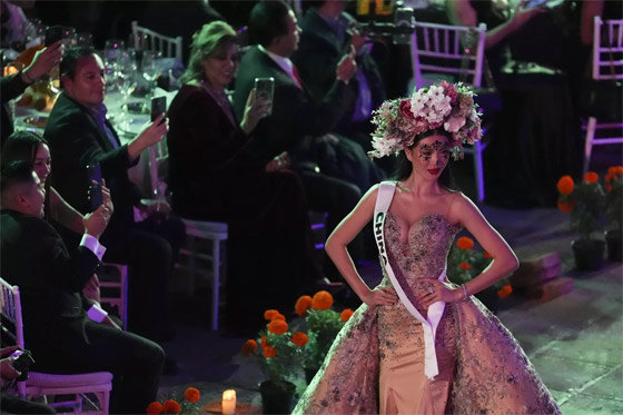 - ملكة جمال إيطاليا جليلاني كافالكانتي، خلال مشاركتها في مسيرة كاترينا بمناسبة "يوم الموتى" قبل أسابيع من مسابقة ملكة جمال الكون الثالثة والسبعين، في مكسيكو سيتي.