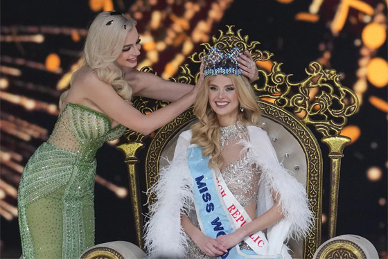 - توجت البولندية كارولينا بيلاوسكا، على اليسار، خليفتها كريستينا بيشكوفا من جمهورية التشيك بعد فوزها بمسابقة ملكة جمال العالم الـ71 في مومباي الهندية.