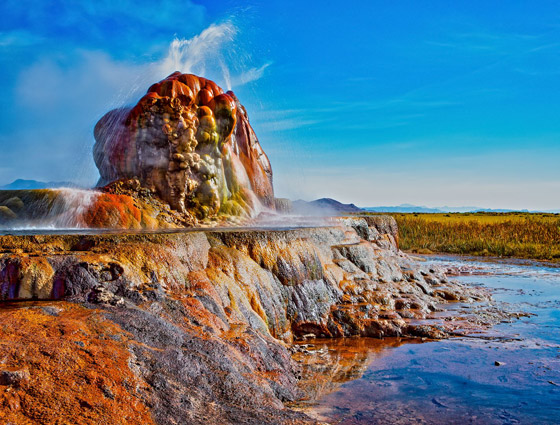 تقع نافورة فلاي جيزر في نيفادا بأمريكا، وهي عبارة عن نبع ماء ساخن يتدفق من باطن الأرض ويحتوي على معادن مختلفة تترسب على شكل تلال ملونة ومتدرجة؛ ما يجعلها تبدو وكأنها فوهة بركان صغيرة. تتميز هذه النافورة بألوانها الزاهية التي تتغير باستمرار مع تغير درجة حرارة الماء وكمية المعادن المترسبة. تتكون نافورة فلاي جيزر من ثلاثة تلال ترتفع من صحراء نيفادا الشمالية.