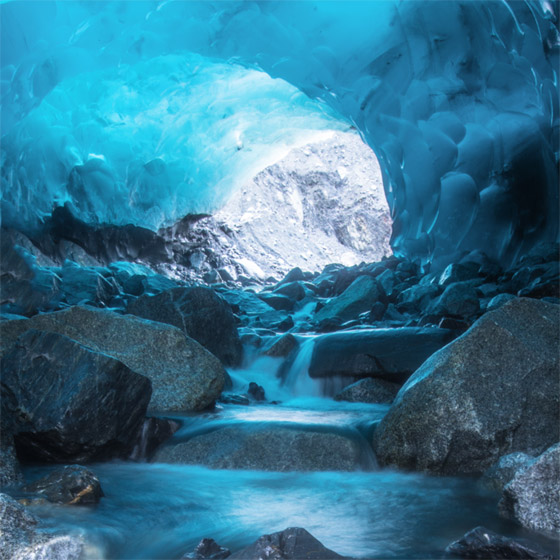بالنسبة لأولئك الذين يرغبون في تحمل درجات الحرارة الشديدة، فإن أنفاق تكوينات الجليد الأزرق في كهوف مندنهال الجليدية مغامرة تستحق الاستكشاف. يقع نهر مندنهال الجليدي على بعد حوالي 12 ميلاً خارج جونو، ألاسكا؛ إذ يمتد لمسافة 12 ميلاً أخرى داخل وادي مندنهال. كان لتغير المناخ تأثير سلبي في النهر الجليدي؛ ما تسبب في تراجعه بمقدار ميلين تقريباً على مدار السنوات الستين الماضية، وإذا ذاب الجليد واستمرت الكهوف في التحول، فقد تصبح في النهاية غير قابلة للوصول إلى البشر، ولكن في الوقت الحالي، تترك درجات اللون الأزرق المذهلة للكهوف الجليدية علامة لا تُمحى على أي شخص يقوم برحلة إلى داخلها.
