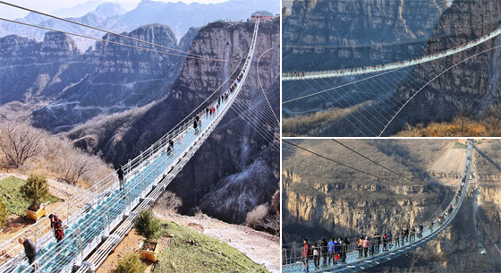 بعد أن استغرق بناؤه 3 سنوات، افتتح جسر هونغ ياغو Hongyagu في نهاية عام 2017. يمتد هذا الجسر لمسافة 488 متراً (1600 قدم) بارتفاع 220 متراً (722 قدماً) ويربط ذروتين في المنطقة الجبلية شمال شرقي الصين، ما يكفي لشعور العابرين فوقه بتوتر شديد. قرَّر مصممو الجسر إضافة أرضية زجاجية حتى يتمكن المستخدمون من رؤية منظر رائع للوادي تحته.