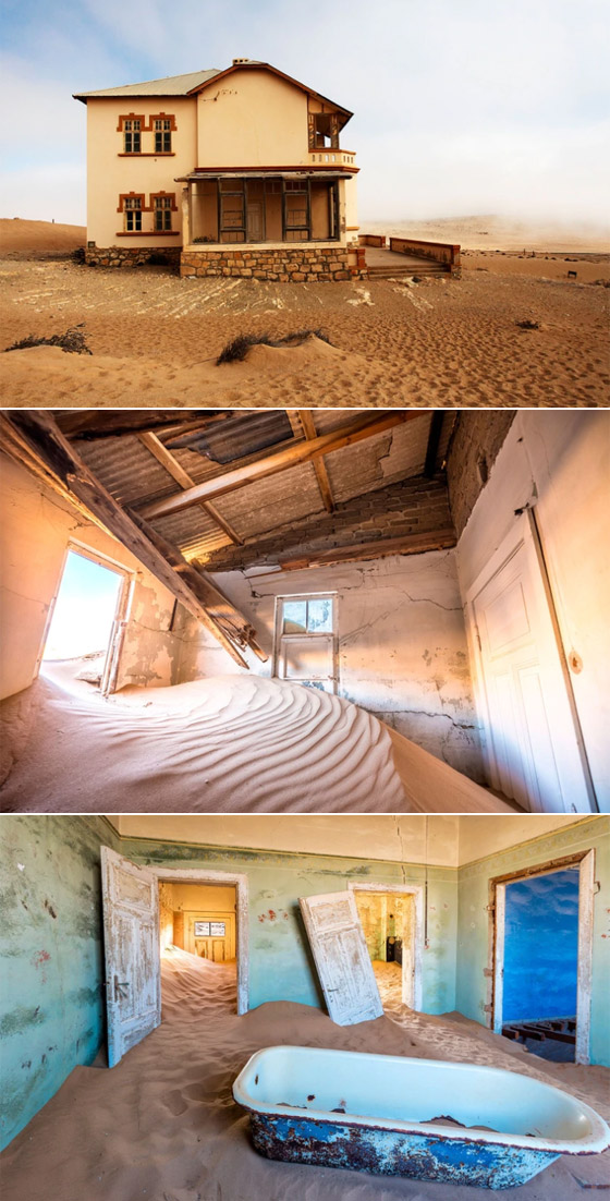 3. كولمانسكوب، ناميبيا: كانت كولمانسكوب في قمة مجدها في أوائل القرن العشرين، حين جاء عمال المناجم الألمان إلى المنطقة للبحث عن الألماس. وأحضروا معهم العمارة الألمانية، التي أعطت هذه المنطقة الصحراوية مظهراً فخماً مختلفاً عن المكان. بدأ تدهور المدينة بعد مدة وجيزة من الحرب العالمية الأولى، لكن اكتشاف منطقة غنية بالألماس على طول الساحل في عام 1928 كان هو القشّة التي قصمت ظهر البعير. هرع معظم سكان كولمانسكوب إلى الوجهة الجديدة، تاركين وراءهم أمتعتهم والمدينة، ومنذ ذلك الحين، التهمت الصحراء كولمانسكوب وأصبحت مهجورة.