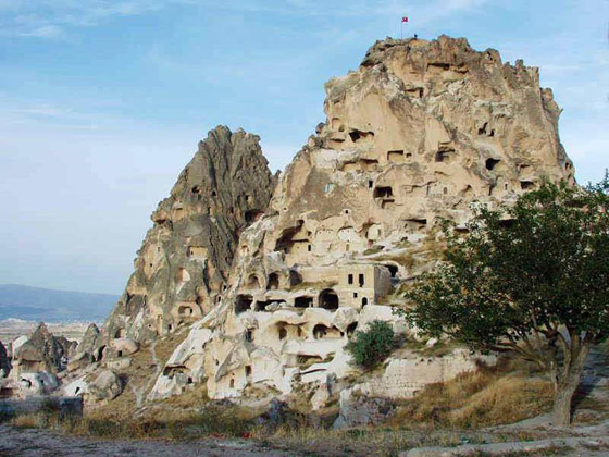 وأطلق البركان القريب منها حممه على فترات طويلة، فكانت تتساقط على تلك الطبقة الصخرية، لتتشكل طبقة سوداء من الحمم المتحجرة على السطح. تآكلت الطبقة الصخرية بفعل عوامل الطبيعة، وتفتتت، وتباعدت، إلى أن تشكلت صخوراً منفردة، منها الضخم، ومنها المتوسط، والصغير. وعندما وفد الانسان الأول إليها، وجد فيها إمكانية سكن بحفر أوكار له فيها، حيث يسهل نحتها. حتى أن بعض الصخور الضخمة شكلت قرية قائمة بذاتها، فيها العديد من البيوت في طبقات متعددة، وفيها الطرقات المتصاعدة في أنحائها، والمؤدية إلى المنازل المنتشرة فيها كقلعة "أوشيزار".