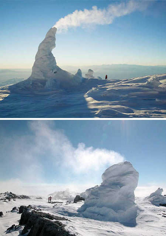 2- أبراج الجليد (قارة أنتاركتيكا): تتواجد أبراج الجليد في قارة أنتاركتيكا المتجمدة على قمة جبل إيربيس والذي يحتوي على أكبر البراكين النشطة في العالم والذي يشتهر في الأوساط البركانية ببحيراته البركانية النشطة باستمرار. يتصاعد من جبل إيربيس الغازات الساخنة الناجمة عن الحمم البركانية فتمر عبر الشقوق والكسور في الجبل فتشكل على إثر ذلك هذا النظام المعقد من أبراج الجليد والكهوف الجليدية المذهلة في جميع أنحاء الجبل.