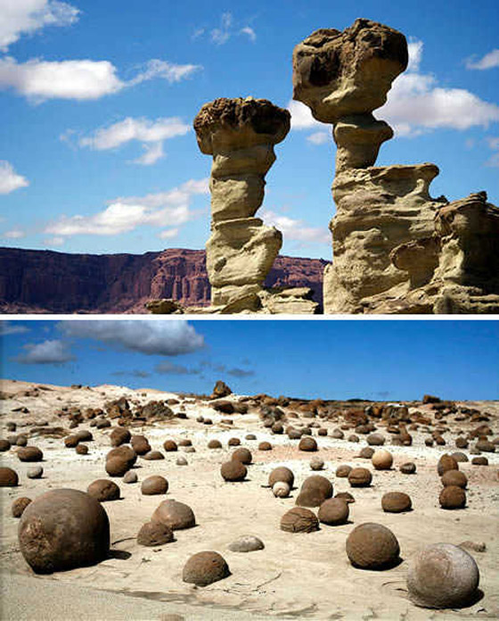 4- وادي القمر (الأرجنتين): تكون هذا الوادي نتيجة بعض التكوينات الجيولوجية الناجمة عن عوامل التعرية "الرياح" وهو واد بعيد في الأرجنتين، ويضم هذا الوادي العديد من أشكال الصخور والحجارة المذهلة والتي تبدو مثل قطع الرخام العملاقة. كان ذلك المكان منذ زمن بعيد عبارة عن أرض خصبة، أما الآن فهو أرض قاحلة تحتوي على العديد من حفريات النباتات والحيوانات والتي تعد مزارا رئيسيا لعلماء الحفريات من جميع أنحاء العالم للقيام بدراستها.