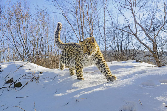 - نمر صغير يمشي بثقة عبر الثلج في بريمورسكي كراي.