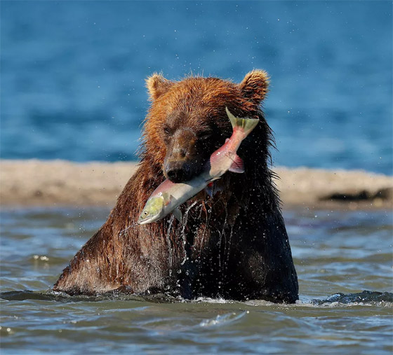 - دب بني يصاد سمكة ويضعها في فمه في أحد الأنهار التي تتدفق إلى بحيرة كوريل في إقليم كامتشاتكا.
