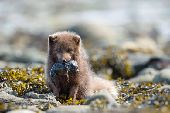 - الثعلب القطبي بفمه سمكة الضفدع في إقليم كامتشاتكا.