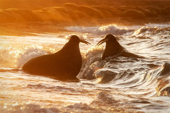 - حيوانات الفظ مع شروق الشمس في بحر بيتشورا.