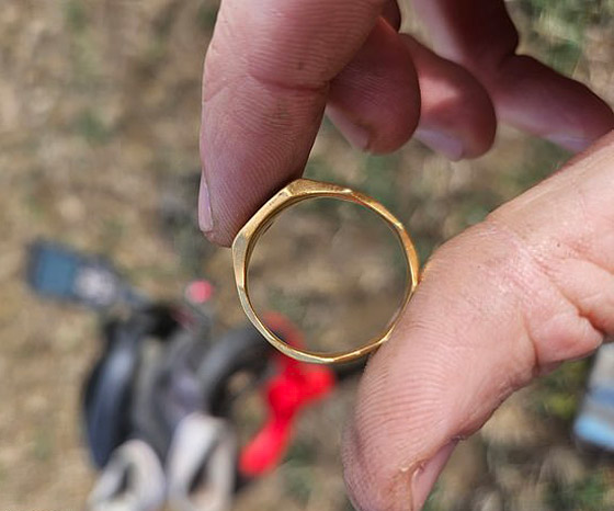 وبعد يوم لم يعثر خلاله إلا على مسمار صدئ وحدوة حصان وقطع من الرصاص، توقف في مساره بسبب إشارة قوية. وقام رجل يبلغ من العمر 32 عامًا بحفر 8 بوصات في التربة واكتشف خاتمًا ذهبيًا رائعًا يحمل نقشًا معقدًا للقديس الشهيد الكاثوليكي كريستوفر.
