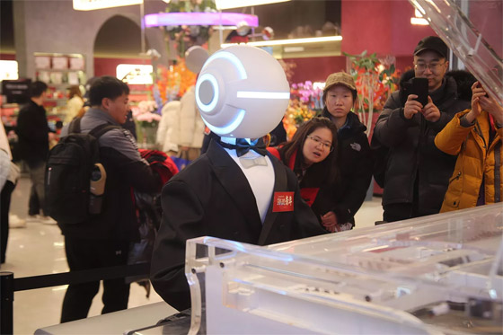- زوار يشاهدون ويصورون روبوتا يؤدي عرضًا في معرض للعلوم والتكنولوجيا في بكين في الصين.