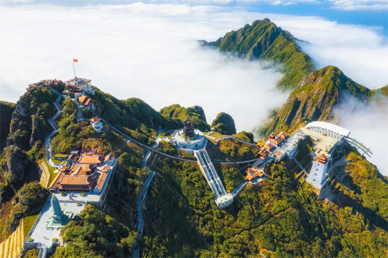 - منظر جوي يظهر الضباب وهو يغطي معبد البوذية في جبل فانسيبان، في سابا بفيتنام.