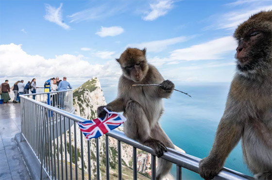 - قرد يجلس على سياج منصة مشاهدة على صخور جبل طارق، وهو يحمل علم المملكة المتحدة، الذي سرقه من أحد السائحين.