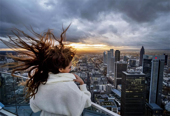 - تطاير شعر سائحة فرنسية شابة مع غروب الشمس على منصة المشاهدة في "برج ماين"، فرانكفورت بألمانيا.