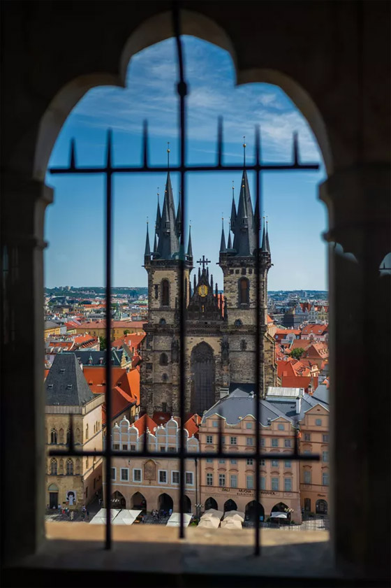 - منظر لكنيسة السيدة العذراء أمام الساعة الفلكية في برج قاعة المدينة القديمة، براغ.