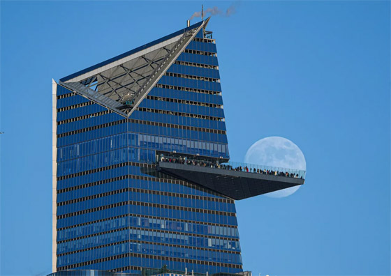 - صورة تظهر القمر مع غروب الشمس خلف منصة المراقبة الخارجية في مدينة نيويورك في "هودسن يارد"، الولايات المتحدة الأمريكية.