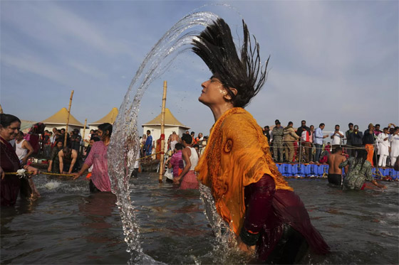 6. الممثلة الهندية رافينا تاندون، تقوم بغطسات في سانغام، ملتقى أنهار الغانج، ويامونا، وساراسواتي الأسطورية، خلال مهرجان "ماها كومبه" في براياغراج، الهند.
