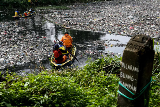 8. أشخاص ينظفون أكوامًا من النفايات في نهر سيتاروم في باندونغ، إندونيسيا.