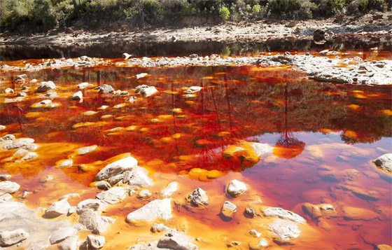 9. صورة مياه حمراء في نهر ريو تينتو بمنطقة ميناس دي ريوتينتو للتعدين، مقاطعة هويلفا، إسبانيا.