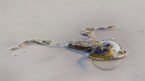 - صورة لضفدع في بالون أثناء جلسة تصوير في البركة (الصورة الفائزة بفئة الزواحف للمصور إيبرهارد إهمكي).