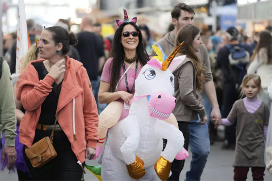 - امرأة مع بالون على شكل وحيد قرن وسط الحشود خلال معرض الخيول الدولي في مركز المعارض في إيسن بألمانيا.