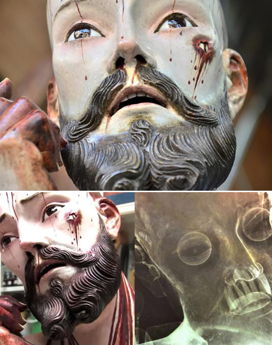 كاد العلماء المكسيكيون لا يصدقون أنفسهم من هول ما عثروا عليه بالعام 2014، عندما كانوا يقومون بترميم تمثال خشبي يجسد المسيح عمره قرابة الـ200 عام، ويعود إلى القرن الثامن عشر تقريباً، وذلك بعد اكتشافهم وجود أسنان بشرية حقيقية في التمثال لحظة تعريضه لأشعة "إكس". ووفقاً لما ذكره موقع ألماني الناطق بالعربية حينها، أن العلماء رجحوا بأن هذه الأسنان البشرية الحقيقية، تخص أحد المتبرعين التابعين لهذه الكنيسة. وأضاف الموقع أنه كانت تجري العادة في تلك الحقبة الزمنية، أن تكون أسنان وأظافر التماثيل مصنوعة من الخشب أو من عظام الحيوانات.