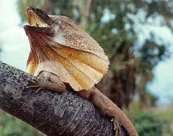 1. السحلية ذات الرقبة: تعرف هذه السحلية باسم "التنين"، وتتميز بزوائد جلدية بارزة عند الرأس والرقبة، وعندما تشعر بالخطر تفتح فمها فتظهر بطانة وردية أو صفراء اللون، وتزحف السحلية على 4 أرجل على الأرض، لكن في وقت الخطر تركض على الساقين الخلفيتين.