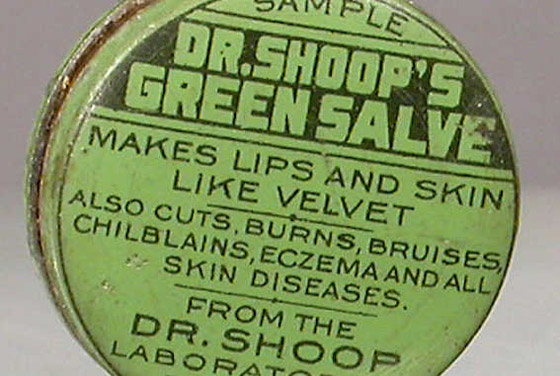 3- المرهم الأخضر: اخترع الطبيب كلارندون شوب في راسين بولاية ويسكونسن عام 1920م المرهم الأخضر لجعل الجلد والشفاه وردية مثل المخمل، وكذلك لعلاج الحروق، والكدمات، وتورم الأصابع، وجميع الأمراض الجلدية، وكان واحدا من العديد من العلاجات التي تباع في متجره الطبي، وشهد نجاحا كبيرا، حيث اعتمدت شركة شوب على الدعاية العدوانية للترويج لمنتجاتها.