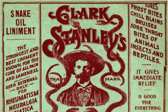 5- مرهم زيت الأفعى: مرهم الشفاء المصنوع من زيت الثعبان الذي يتم جلبه من آسيا عن طريق العمال الصينيين الذين يعملون على السكك الحديدية عبر القارات، فقد كان العلاج الشعبي في الطب الصيني التقليدي، ولم يكن موجودا في الولايات المتحدة، وبالتالي لا يمكن أن يستغل بسهولة من قبل الأمريكيين، وبدأت الشركات ورجال الأعمال حصاد الحيات لاستخدامها في الطب خلال القرن التاسع عشر عام 1890م.