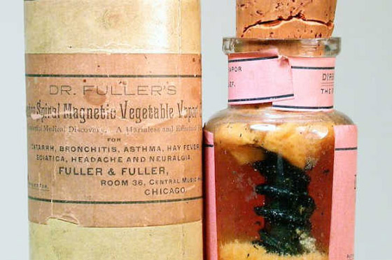 10- بخار الخضار المغناطيسي: هذا الدواء من اختراع الدكتور فولر، يتم نزع سدادة الزجاجة، واستنشاق البخار، يباع بدولار واحد، ابتداء من 1888 حتى 1906م، له تأثير سحري لعلاج الصداع، والألم العصبي، والبحة في الصوت، والدوخة، والربو، ونزلات البرد في الرأس، وعرق النسا، والصداع العصبي، وجميع أمراض الغشاء المخاطي.