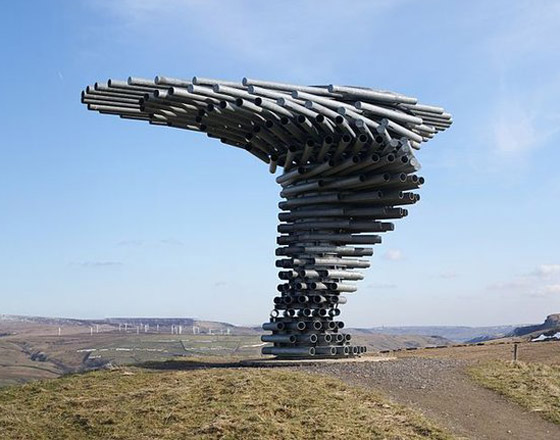7- الشجرة المغنية: اكتملت هذه الآلة الضخمة في عام 2006 وتقع في مدينة بيرنلي في لانكشاير، وهي عبارة عن سلسلة من الأنابيب تصدر أصواتاً عندما تهب الرياح من خلالهم.