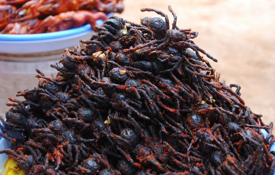 العناكب المقلية هي طعام غريب وجذاب لكمبوديا. يتم تسويقها إلى حد كبير في مدينة Skuon في كمبوديا والأجانب هم العملاء الرئيسيون للوجبات الخفيفة العنكبوتية في البلاد. يمكن العثور على عدد كبير من العناكب بحجم كف اليد داخل بلدة Skuon. دون فصل أي أجزاء من الجسم قام سكان كمبوديا الأصليين بقلي العناكب بالزيت. واستخدموا أيضًا خليطًا من الملح ومعجون الثوم والفلفل الحار لصنع هذه الوجبة الخفيفة العنكبوتية، أكثر المواد الغذائية المفضلة لدى السياح في كمبوديا.