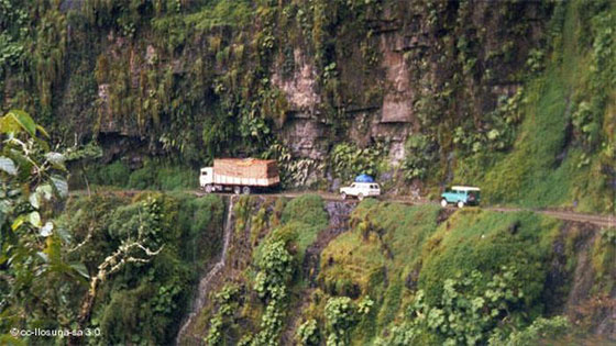 1. طريق يونغاس في بوليفيا: يطلق على هذا الطريق "طريق الموت" بسبب خطورة قيادة السيارة فيه وارتفاعه الشاهق وضيقه. شيّد الشارع في ثلاثينيات القرن الماضي لينقل السكان إلى لاباز، عاصمة بوليفيا، ويبلغ طوله نحو 65 كيلومتراً وارتفاعه 4650 متراً فوق مستوى سطح البحر ويشرف على وادٍ عميق.