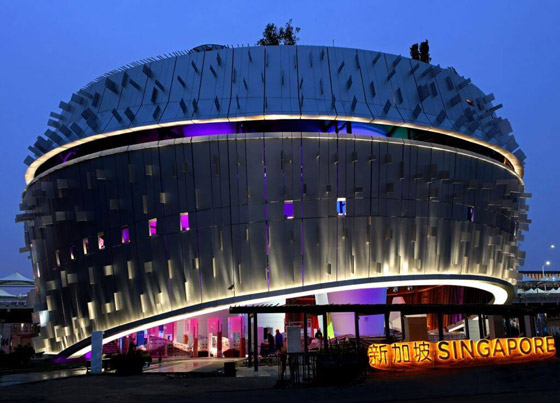 5. جناح سنغافورة - شنغهاوي أكسبو، الصين: يمتد الجناح على مساحة 3000 متر مربع مصمم ليشبه صندوق الموسيقى المكون من ثلاثة أجزاء. أربعة أعمدة بأشكال وأحجام مختلفة تدعم نظامها الهيكلي والأرضيات أعلاه.