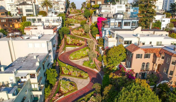 1. شارع لومبارد، بمدينة سان فرانسيسكو، الولايات المتحدة: يُعد شارع لومبارد من أحد أكثر المناطق ازدحاماً في سان فرانسيسكو. ورغم أن الحشود تصطف من أجل الحصول على لقطاتٍ لطريقه المنحدر لتنشرها عبر موقع التواصل الاجتماعي "انستغرام"، إلا أنه يمكنها الحصول على القليل فقط. ويقال إنه أكثر شوارع العالم تعرجاً، وتعد المناظر من أعلى الهضبة بمفردها سبباً كافياً للزيارة، إذ تضفي المباني، ذات الطراز الروسي، المرصوفة على الهضبة جمالاً للمشهد بأكمله.