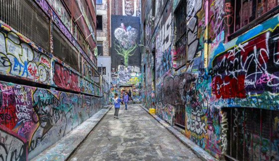 5. زقاق "Hosier Lane"، مدينة ملبورن، أستراليا: واكتسبت مدينة ملبورن شهرةً دولية بفن الشارع الخاص بها. ويتمركز مشهد فن الشارع بزقاق "Hosier Lane"، حيث تغطي جدرانه أعمال فناني الغرافيتي من جميع أنحاء العالم، لذا يجدر بك القيام بجولة سيراً على الأقدام في المنطقة بأكملها للتعرف على الأعمال الفنية هناك واستكشافها بتعمق.