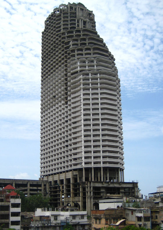 9- ساثورن الفريد في بانكوك تايلاند: يتكون البرج من 49 طابقاً وبدأ البناء عام 1990، ولكن بسبب نقص الأموال والقبض على مصمم المبنى توقف البناء، وأطلق عليه برج الأشباح.