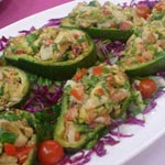6. وزعي السلطة في انصاف الافوكادو. رتبيها على طبق تقديم مفروش بالخس الملون.