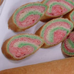 5) تشكيل الرغيف: على سطح مرشوش بالدقيق افردي العجينة البيضاء باستعمال النشابة الى سماكة 2/1 سم تقريبا. افردي العجينة الحمراء والخضراء كذلك.