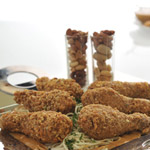 - تُقلّب أرجل الدجاج في خليط الدقيق المُتبل حتى تُغطى تماماً ( مع مراعاة التخلص من الدقيق الزائد)، ثم تُغطى بخليط البيض وأخيراً بالفول السوداني المجروش.
