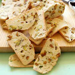 يُقطع خبز الفستق إلى شرائح ويُقدم مع الكمثرى المطهوة ومربى التوت، ويُزين بالفستق المجروش وأوراق النعناع الطازجة.