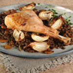 • ننقل العدس إلى وعاء التقديم ونضع فوقه أفخاذ الحبش. نسكب الصلصة المتبقية في الصينية.