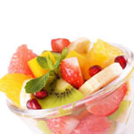 1 ضعي، في طبق عميق الشمام والأناناس والبرتقال والتفاح والموز والفراولة والعنب والكيوي.