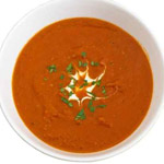 - تُقدم الشوربة دافئة وتجمل بكريمة الفلفل وبعض أوراق الريحان أو الكزبرة الخضرة.