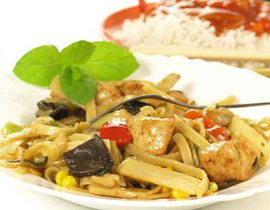 1- تسلق المعكرونة وتصفي وتترك جانبا ويحمر البصل والثوم في الزيت ثم يضاف المشروم والدجاج بعد تقطيعه شرائح رفيعة ويقلب الخليط ويترك على النار حتى ينضج ويضاف الملح والفلفل الأسود والبهارات.