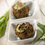 - تحٌشى حبات الخرشوف بالحشوة، ثم نضع فوق الحشوة شريحة بندورة وقطعة زبدة.