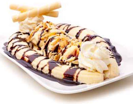 ثالثا: قشري الموز وقطعيه إلى شرائح طولية، وضعيه في طبق التقديم ثم ضعي عليها قالب البوظة ثم صوص الشوكولاطة وانثري عليها المكسرات للتقديم. يحفظ في الثلاجة ويقدم باردا.